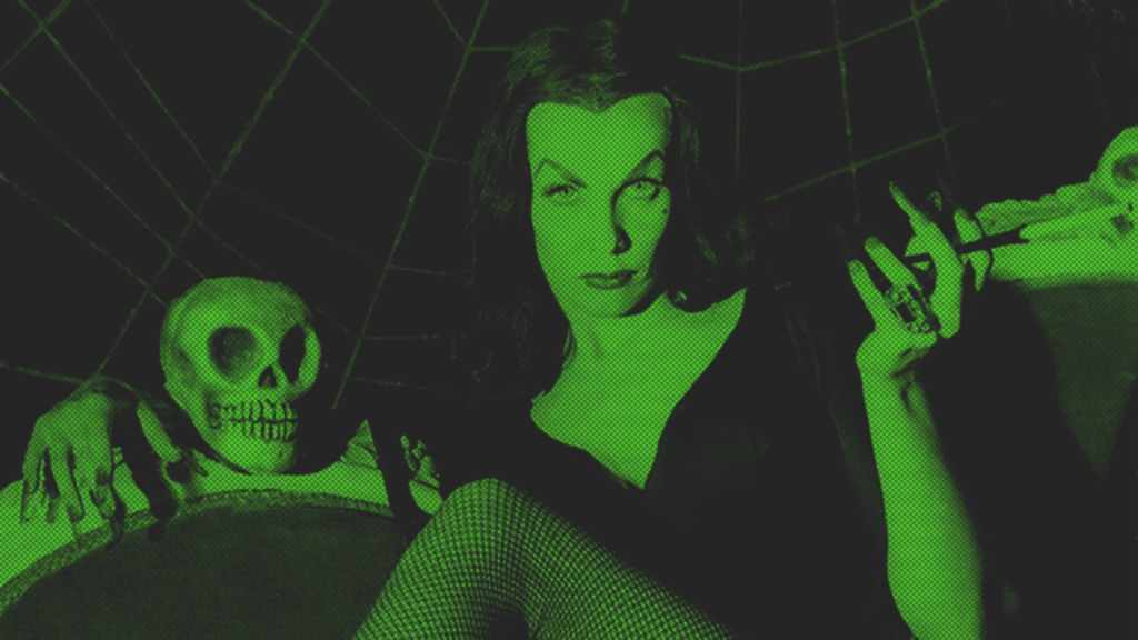 One appearance Maila did make as Vampira was on NBC’s The George Gobel Show. At the time, Gobel’s show boasted a top 10 rating and hosted such luminary stars as Jimmy Stewart and Kirk Douglas. But as it was filmed the same night as The Vampira Show, KABC-TV ordered Maila to reject the offer. She ignored them. The sketch she performed with Gobel perfectly encapsulates Maila’s artistic intent with the Vampira character — a send up of American domesticity dripping with dark, postmodern humour. It’s a veritable blueprint for the screen adaptations of The Addams Family, for Tim Burton’s filmography, and — much to Maila’s dismay — for Cassandra Peterson’s Elvira.