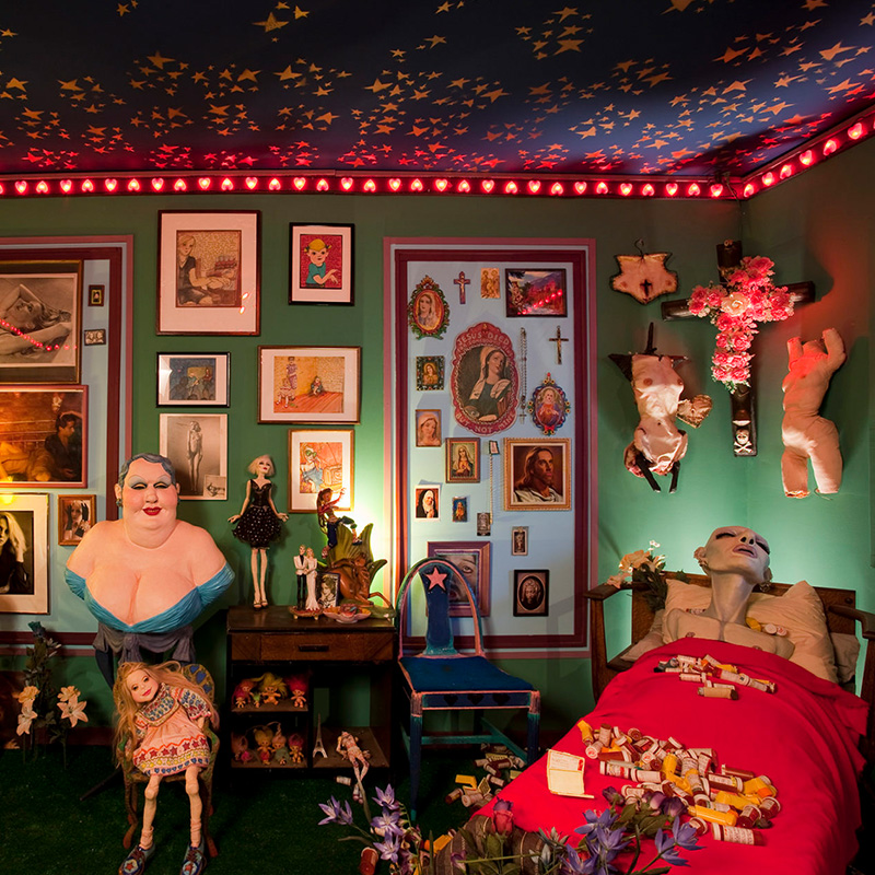 Lankton worked tirelessly on the show for almost a year. During this time, she was reportedly raped in an alley behind her apartment building and developed Toxic shock syndrome (she later recounted the ordeal to a photographer of the Pittsburgh Post-Gazette). Lankton refused to take time off to recover, insisting that she had to complete her work for the exhibit. In October 1996, she recreated her Chicago apartment in the Mattress Factory, building a freestanding ‘white trash’ house with a gate surrounded by an Astroturf patio. Ruby slippers and striped stockinged feet emerged from the threshold, inviting visitors into Lankton’s technicolour world. Inside, fantasy and reality collided, the space wall-to-wall with tchotchkes and pathos-ridden pieces addressing heroin abuse, the AIDS crisis, body dysmorphia and suicidality in a confrontational blend of innocence, hope, degradation and despair. Personal shrines to Patti Smith, Candy Darling, Jesus, and to Lankton herself decorated the walls – a veneration of those who dared to be singularly themselves. The space was punctuated with dolls Greer created throughout her life; most notably, an anorexic bust named More Morphine (1990-1996), deteriorating in a bed prophetically strewn with pill bottles. Lankton wore her cut up and reconstructed wedding dress to the opening of the exhibition.